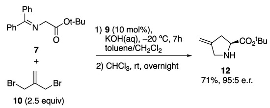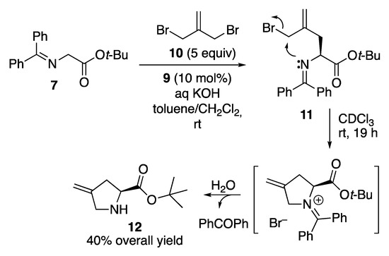 Looking for improved reactivity, we turned our attention to the more activated bis allylic alkylating systems (Scheme 3). The reaction of imine 7 with an excess of 3-bromo-2-(bromomethyl)-1-propene (10) in the presence of catalyst 9 (10 mol%) afforded an interesting mono-alkylated product 11. Unexpectedly, we observed that 11 was converted in situ in the NMR tube to the desired methylene proline 12 in 40% overall yield on standing overnight at room temperature.