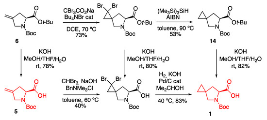 Subsequently, we proposed the preparation of amino acid 1. Direct cyclopropanation using the classical Simmons–Smith reaction (ZnEt2, CH2I2) of 12, 6 or 5 led to complex mixtures with significant amounts of deprotected products, probably due to the necessary acidic media [14]. Better results were achieved by addition of dibromocarbene species to the double bond followed by debromination. Several sequences of cyclopropanation/debromination/deprotection procedures were explored based on the results reported for Me esters [15] (or the free acid) [9] analogues in the literature (Scheme 5).