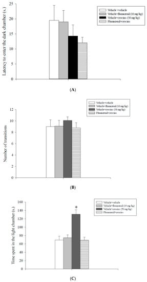 2.1. Experiment 1: Effects of Acute Administration of Crocins and Flumazenil on Rats’ Performance in the Light/Dark Test