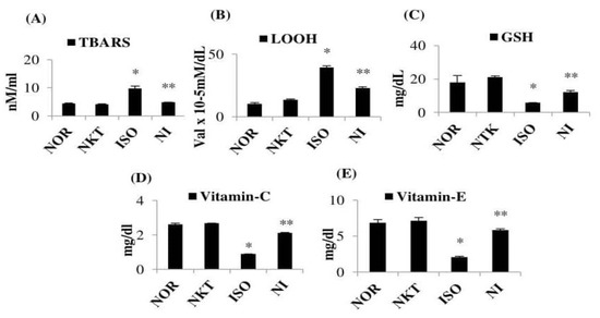 ISO injections in rats caused a significant (p < 0.05) increase in the levels of plasma lipid peroxidation products such as TBARS and LOOH with a significant (p < 0.05) decrease in the levels of plasma non-enzymatic antioxidants such as GSH, vitamin C, and vitamin E compared to normal control rats. Pre- and cotreatment with NKT showed a significant (p < 0.05) decrease in the levels of plasma lipid peroxidation products with a significant (p < 0.05) increase in the plasma non-enzymatic antioxidants in comparison with ISO control rats (Figure 3A–E).