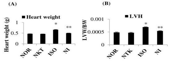 Effect of NKT on heart weight and left-ventricular hypertrophy (LVH): (A) heart weight and (B) LVH in the myocardium. Each column is the mean ± SEM for eight rats in each group; * p < 0.05 as compared to the normal control (Group-I), ** p < 0.05 as compared to the ISO control (Group-III) (DMRT).