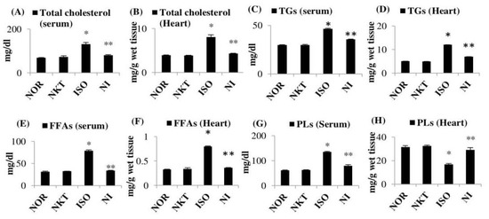 Effect of NKT on the levels of lipids/concentrations of lipids: (A–H) levels/concentrations of total cholesterol, triglycerides (TGs), free fatty acids (FFAs), and phospholipids (PLs) in the serum and heart. Each column is the mean ± SEM for eight rats in each group; * p < 0.05 as compared to the normal control (Group-I), ** p < 0.05 as compared to the ISO control (Group-III) (DMRT).