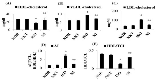 Effect of NKT on lipoproteins, AI, and high-density lipoprotein (HDL)/TCL ratio: (A–C) levels of serum lipoproteins (HDL cholesterol, low-density lipoprotein (LDL) cholesterol, and very-low-density lipoprotein (VLDL) cholesterol); (D,E) AI and HDL/TCL ratio. Each column is the mean ± SEM for six rats in each group; * p < 0.05 as compared to the normal control (Group-I), ** p < 0.05 as compared to the ISO control (Group-III) (DMRT).