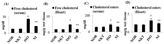 Effect of NKT on free cholesterol and cholesterol esters in the serum and heart: (A–D) the levels/concentrations of free cholesterol and cholesterol esters in the serum and heart. Each column is the mean ± SEM for eight rats in each group; * p < 0.05 as compared to the normal control (Group-I), ** p < 0.05 as compared to the ISO control (Group-III) (DMRT).