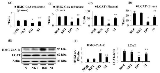 Effect of NKT of lipid marker enzymes in the plasma and liver: (A,B) activity of 3-hydroxy-3-methylglutaryl coenzyme-A reductase (HMG-CoA) reductase in the plasma and liver. Each column is the mean ± SEM for eight rats in each group; * p < 0.05 as compared to the normal control (Group-I), ** p < 0.05 as compared to the ISO control (Group-III) (DMRT). In group III, the lower ratio of HMG-CoA/mevalonate indicates higher enzyme activity and, in Group IV, a higher ratio of HMG-CoA/mevalonate indicates lower enzyme activity; (C,D) activity of lecithin cholesterol acyltransferase (LCAT) in the plasma and liver. Each column is the mean ± SEM for eight rats in each group; * p < 0.05 as compared to the normal control (Group-I), ** p < 0.05 as compared to the ISO control (Group-III) (DMRT). * Units: μM of cholesterol esterified/h/mL for plasma LCAT and μM of cholesterol esterified/h/mg protein for liver; (E,F) Western blotting analysis of HMG-CoA-R and LCAT in the liver and the densitometric analysis. Columns not sharing a common symbol (*, **) differ significantly from each other (* p < 0.05 vs. normal control, ** p < 0.05 vs. ISO control).