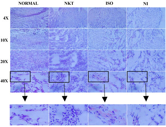 To conduct the animal experiments, laboratory-bred, male Wistar rats (200–250 g) were obtained from the animal research facility of the College of Medicine and Health Sciences, United Arab Emirates University. The rats were housed in polycarbonate cages (47 × 34 × 20 cm3) (four rats per cage) lined with husk, renewed every 24 h under a 12 h light/dark cycle at around 22 °C with 50% humidity. The animals were divided into four groups containing 15 animals each. Prior to the start of the experiment, the rats were acclimatized for a week to the laboratory conditions. Each animal had free access to the commercially available rodent chow diet and purified water ad libitum. The rats were administered either ISO or the test drug, NKT, at a fixed time, and they were euthanized during the daytime. Approval for the experimental protocol and procedure adopted in the conduct of the animal experiments was obtained from the Animal Ethics Committee of the United Arab Emirates University, United Arab Emirates.