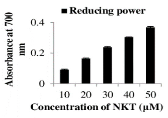 The reducing power of NKT at varying concentrations was measured in an in vitro setting (Figure 10). NKT shows potential reducing power with higher concentrations. The reducing power of NKT measured at 700 nm for the different studied concentrations (10, 20, 30, 40, and 50 µM) was found to be 0.091, 0.164, 0.237, 0.303, and 0.367, respectively. The results demonstrate that NKT is a potent reductant, and the reducing actions of NKT correlate with its antioxidant property.
