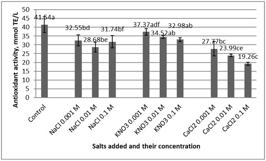 The addition of KNO3 produced no statistically significant changes in the value of the antioxidant activity, whereas the other two salts, i.e., CaCl2 and NaCl, lowered this parameter. The most drastic decrease was observed in the extract containing CaCl2 at 0.1 M concentration. Calcium chloride also decreased the antioxidant activities of grape marc, chokeberry and red cabbage extracts in previous studies [21,22,32].