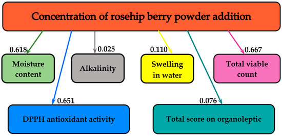 Figure 5 summarizes the influences of the different amounts of added rose hip powder on the physicochemical indicators (moisture content, alkalinity, swelling index), the total score of organoleptic indices, the in vitro DPPH antioxidant activity, and the microbiological stability (TVC) of the biscuits. The values of mutual influence are presented on the arrows.