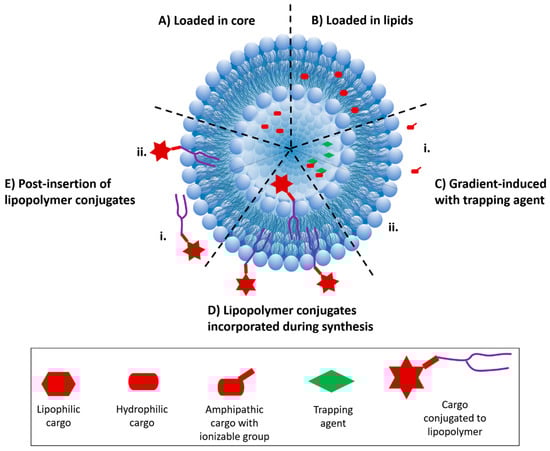 A major challenge in the formulation of liposome-based materials for drug delivery is the loading of the drug cargo(s) into/onto the liposomal carrier [,,,]. Poor drug loading efficiency not only wastes valuable drug molecules but also compromises therapeutic outcomes in experimental and clinical applications [,]. Unlike many other NPs, liposomes offer the advantage of having multiple different environments wherein the drug cargo can be interfaced. These include the hydrophilic aqueous core, the lipophilic phospholipid membrane bilayer, and the NP surface for direct drug conjugation/association [,]. These different environments offer varying degrees of drug loading capacity, release kinetics, protection against innate drug toxicity, tailored pharmacokinetic profiles, and overall therapeutic efficacy [,,,].