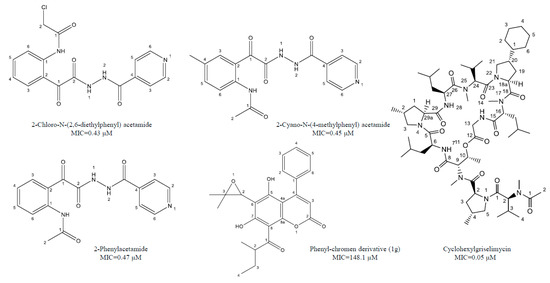 Chemical structure of lead isoniazid, coumarin and griselimycin derivatives with minimum inhibitory concentrations (MICs) value.