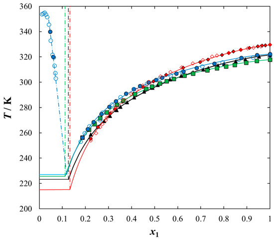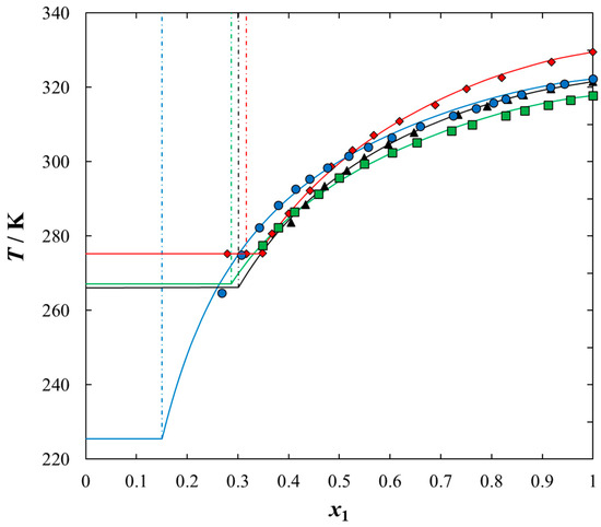 (Solid + liquid) and (liquid + liquid) phase equilibria, SLE and LLE, were determined using the well-known dynamic (synthetic) method [20]. The mixtures of the IL and the solvent were prepared by weighing the pure components on Mettler Toledo AB204-S balance (Greifensee, Switzerland) with an uncertainty of 1 × 10−4 g. The Pyrex glass cell with a well-known mole fraction (x1) solution was immersed in a thermostatic bath. The sample was heated very slowly (less than 2 K·h−1 near the equilibrium temperature) with continuous and vigorous stirring inside the cell. The solid phase disappearance temperatures, detected visually, (the equilibrium temperature of last crystal disappearance in the case of SLE measurements), or two phase disappearance (in the case of LLE measurements) during increasing temperature were measured with an electronic thermometer P550 (DOSTMANN Electronic GmbH, Wertheim, Germany). The uncertainty of the temperature measurement was 0.1 K. The experiments were carried out over a wide range of the IL mole fractions (x1) at a temperature range up to T = 365 K at pressure, p = 0.1 MPa.