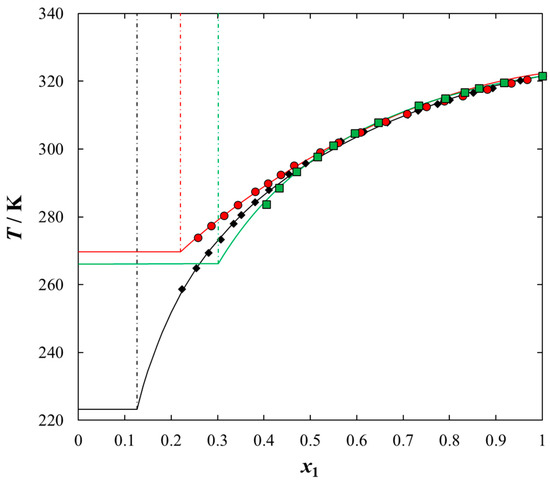 where the stands for the enthalpy of fusion; R for the ideal gas constant; is the normal temperature of fusion; and is an activity coefficient of solute i in the liquid phase. When the solution is assumed as ideal (), the SLE phase diagram can be modeled based only on the melting properties of the pure components. Ideal solubility is represented by the dashed line in Figure 1. However, if the system deviates from ideal behavior, the activity coefficients of components in the liquid phase can be calculated using well-developed gE models or equations of state. For the systems from this work, the NRTL model was chosen. The activity coefficient, , depends on , T, and some parameters , provided by the NRTL model.