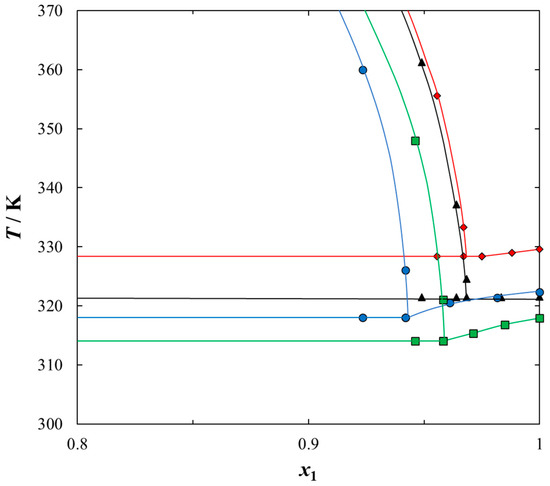 The (solid + liquid) phase equilibrium (SLE), and the (liquid + liquid) phase equilibrium (LLE) in binary systems composed of quinolinium, or isoquinolinium-based ILs with bis{(trifluoromethyl)-sulfonyl}imide anion as well as their thermophysical properties have been investigated in our laboratory [18,19,20,21,22,23]. So far, the synthesis, thermophysical properties including temperatures and heat effects of phase transitions, the temperature dependence of the density and viscosity of pure ILs as well as the solubility in aromatic hydrocarbons and alcohols have been presented for the following ILs: N-butylquinolinium bis{(trifluoromethyl)sulfonyl}imide, [BQuin][NTf2] [18], N-isobutyl-quinolinium bis{(trifluoromethyl)sulfonyl}imide, [BiQuin][NTf2] [19], N-hexylquinolinium bis{(trifluoromethyl)sulfonyl}imide, [HQuin][NTf2] [20], N-hexyliso-quinolinium bis-{(trifluoromethyl)sulfonyl}imide, [HiQuin][NTf2] [21], N-octylquinolinium bis{(trifluoro-methyl)sulfonyl}imide, [OQuin][NTf2] [22], and N-octylisoquinolinium bis{(tri-fluoromethyl)-sulfonyl}imide [OiQuin][NTf2] [23]. The binary systems of these compounds with aromatic hydrocarbons and alcohols have shown the eutectic systems with immiscibility in the liquid phase with an Upper Critical Solution temperature (UCST). The solubility of these ILs in benzene revealed the lowest immiscibility gap (the highest solubility of benzene in the IL) in comparison with alkylbenzenes (toluene, ethylbenzene, and n-propylbenzene). For some of these ILs such as [BQuin][NTf2], [OQuin][NTf2], and [OiQuin][NTf2], the mutual solubility with thiophene were presented earlier [24,25]. In the case of a binary system with thiophene, the similar shape of the SLE curve was reported as for a close-melting substances. However, the difference was observed in the LLE with thiophene, where the immiscibility gap was less steep and the UCST was below the boiling point of the solvent. The UCST was determined experimentally as TUCST = 325.6 K (x1 = 0.0174) and TUSCT = 355.0 K (x1 = 0.0227) for [OiQuin][NTf2] and [OQuin][NTf2], respectively [24,25]. When comparing LLE of the thiophene systems for different quinolinium-based ILs, the immiscibility gap increased with the decrease of an alkyl chain length substituent in the cation of the IL. Changing the cation from quinolinium to isoquinolinum, a lower immiscibility gap was observed due to the better accessibility of the alkyl chain [24,25]. For modeling new technological processes such as extractive distillation or liquid–liquid extraction, the knowledge of the phase equilibria, both SLE, and LLE, and the correlation and prediction of the phase equilibria is very important. The fundamental changes in phase equilibria are connected with different substituents in the cation or anion of the IL This knowledge is important for ILs used as replacement solvents in industry.