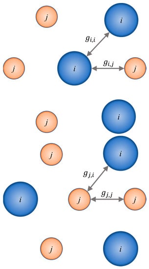 Two types of molecular clusters or cells of binary liquid mixtures. Each molecule of type i or of type j is regarded as being surrounded by molecules of both types in proportions determined by the Gibbs energies of interaction, gjj, which are indicated in the diagram.