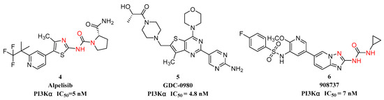Phosphoinositide 3-kindase (PI3K) is a conserved family of lipid kinases, which is composed of the catalytic subunit p110 and the regulatory subunit p85 or p101. PI3K can phosphorylate the 3-hydroxyl of phosphatidylinositol 4,5-bisphosphate (PIP2) to generate phosphatidylinositol 3,4,5-trisphosphate, PIP3) [11]. As a second messenger, PIP3 plays an important role in cell survival, growth, proliferation and metabolism. The tumor suppressor gene PTEN (phosphatase and tension homolog deleted on chromosome ten) can dephosphorylate PIP3 to generate PIP2, which is an antagonist of the catalytic effect of PI3K [12]. However, it was found that PTEN was the most mutated tumor suppressor gene [13] in endometrial tumors, central nervous system diseases, skin cancer and prostate cancer. Cancer gene research has shown that the PI3K signaling pathway is the most susceptible to mutation in human tumors, and has been a popular target for tumor treatment. Representative drugs have Alpelisib (4) [14], GDC-0980 (5) [15], 908737 (6) [16], etc. (Figure 2)