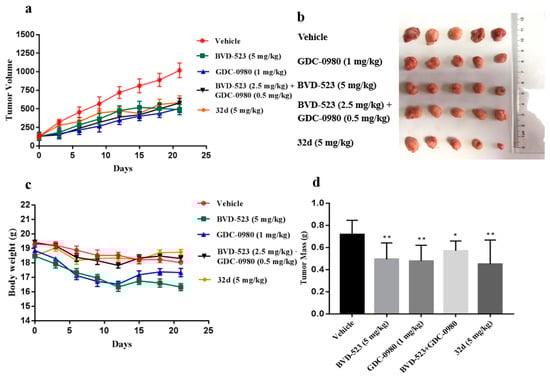 Male five-week-old Balb/c-nude mice (18–20 g) were injected subcutaneously with HCT-116 cells (5 × 107/mL cells suspended in Matrigel Matrix). When the tumor reached a volume of approximately 100 mm3, the mice were randomly assigned to five groups (six mice for each group) and treated with vehicle (5% (v/v) DMSO), 32d (5 mg/kg), BVD-523 (5 mg/kg), GDC-0980 (1 mg/kg) and BVD-523 + GDC-0980 (2.5 mg/kg + 0.5 mg/kg). All mice were administered by intraperitoneal q.d. The tumor volumes were measured using electronic digital calipers every 3 days and were calculated as 1/2 length × width × width.