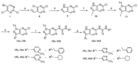 Preparation of target compounds 16a~16d. Reagents and conditions: (a) 1.3 M i-PrMgCl·LiCl, dry DMF, THF, −78~−42 °C, 24 h; (b) 80% N2H4·H2O, THF, 0 °C, 1 h; (c) NIS, DMF, rt, 12 h; (d) TrtCl, K2CO3, MeCN, rt, 12 h; (e) (2-methyl pyridin-4-yl)boronic acid (12a) or 1-methyl-4-(4,4,5,5-tetramethyl-1,3,2-dioxaborolan-2-yl)-1H-pyrazole (12b), Pd(dppf)Cl2, K2CO3, V(1,4-dioxane):V(H2O) = 5:1, N2, 60 °C, 2 h; (f) Cyclopentylurea (14a) or Benzyl urea (14b), Pd2(dba)3, Xantphos, Cs2CO3, PhMe, N2, 110 °C, 3 h; (g) F3CCO2H, DCM, rt, 12 h.