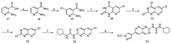 Preparation of target compounds 24. Reagents and conditions: (a) NH4Cl, HOBt, DIEA, EDCI, DMF, rt, 12 h; (b) 30% H2O2, conc. HCl, 60 °C, 6 h; (c) Diphosgene, 120 °C,12 h; (d) POCl3, DMF, 130 °C; (e) Bu3SnH, Pd(PPh3)4, PhMe, N2, 100 °C,1 h; (f) Cyclopentylurea (14a), Pd(OAc)2, XantPhos, t-BuOK, 1,4-dioxane, 60 °C, N2, 2 h. (g) 1-methyl-4-(4,4,5,5-tetramethyl-1,3,2-dioxa borolan-2-yl)-1H-pyrazole (12b), Pd(dppf)Cl2, K2CO3, V(1,4-dioxane):V(H2O) = 5:1, 60 °C, N2, 2 h.