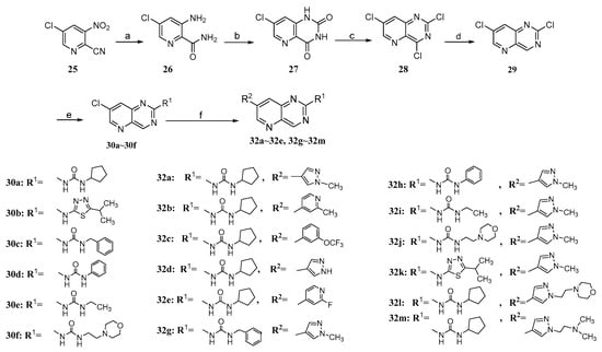 Preparation of target compounds 32a~32e and 32g~32m. Reagents and conditions: (a) SnCl2·2H2O, EtOH, reflux, 2 h; (b) Triphosgene, 1,4-dioxane, 110 °C, N2, 12 h; (c) POCl3, DIEA, 130 °C, N2; (d) Bu3SnH, Pd(PPh3)4, PhMe, N2, 100 °C, 1 h; (e) Cyclopentylurea (14a)/Benzylurea (14b)/Phenylurea (14c) Ethylurea (14d)/1-(2-morpholinoethyl)urea (14e)/5-methyl-1,3,4-thiadiazol-2-amine (14f), Pd(OAc)2, XantPhos, t-BuOK, 1,4-dioxane, 60 °C, N2, 2 h. (f) (2-methylpyridin-4-yl)boronic acid (12a)/1-methyl-4-(4,4,5,5-tetramethyl-1,3,2-dioxaborolan-2-yl)-1H-pyrazole (12b)/(3-(trifluoromethoxy) phenyl)boronic acid (12c)/(2-fluoropyridin-4-yl) boronic acid (14g)/4-(2-(4-(4,4,5,5-tetramethyl-1,3,2-dioxaborolan-2-yl)-1H-pyrazol-1-yl)ethyl) morpholine (12d)/N,N-dimethyl-2-(4-(4,4,5,5-tetramethyl-1,3,2-dioxaborolan-2-yl)-1H-pyrazol-1-yl)ethan-1-amine (12e), Pd(dppf)Cl2, K2CO3, V(1,4-dioxane):V(H2O) = 5:1, 60 °C, N2, 2 h.