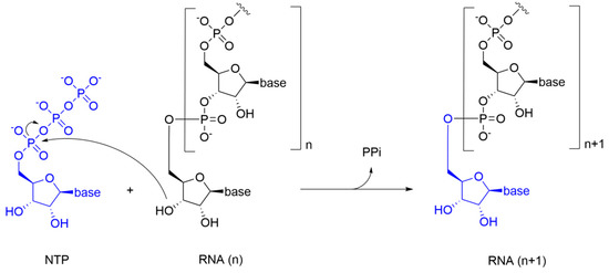 NTPs of the newly synthesized RNA are inserted according to Watson-Crick base pairing rules: U/A is inserted into the nascent RNA strand to pair with A/U from the RNA template, while G/C is inserted to pair with C/G. In the catalytic reaction, the 3’-hydroxyl group of the nascent RNA acts as a nucleophile, attacking the α-phosphate of the incoming NTP and releasing a pyrophosphate molecule (PPi) (Figure 2).