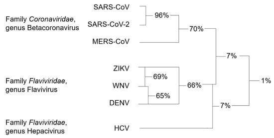 Among Coronaviruses, SARS-CoV-2 RdRp shares the highest amino acid identity (96%) with SARS-CoV RdRp, while homology with MERS-CoV RdRp is only 70%. The average sequence identity is lower among flaviviruses, with ZIKV, WNV, and DENV RdRps sharing 66–69% of amino acids. HCV, belonging to a different genus of the Flaviviridae family, has very limited homology with the members of the Flavivirus genus [53]. For this reason, HCV RdRp was not included in the sequence alignment of Figure 4.