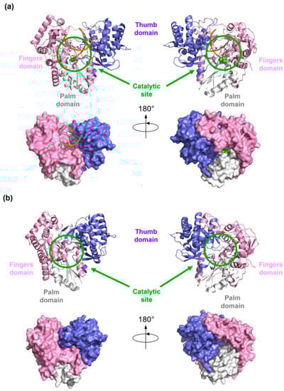 Graphical representations of palm (white), thumb (blue) and fingers (pink) subdomains in (a) RNA-bound RdRp (PDB-ID: 4WTG) and (b) apo RdRp (PDB-ID: 2XI2). The protein structures are represented as cartoons and as surfaces in different orientations. The catalytic site is highlighted by the green circle, and the metal ions are represented as green spheres.