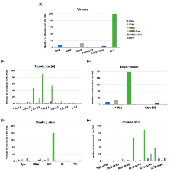Statistics of three-dimensional structures available for SARS-CoV, SARS-CoV-2, ZIKV, WNV, DENV and HCV RdRp in the Protein Data Bank divided by (a) viruses, (b) resolution, (c) experimental methods, (d) binding state and (e) release date. Abbreviation used in (d): Targeted covalent inhibitor (TCI), nucleos(t)ide analogue inhibitor (NI), non-nucleos(t)ide inhibitor (NNI).