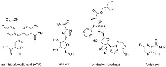 First studies on the inhibition of Coronaviruses’ RdRp were carried out in 2004, following the SARS-CoV epidemic. As already summarized in the work of Wu et al. (2006) [102], cell-based studies identified aurintricarboxylic acid (ATA) (Figure 8) as a selective inhibitor of SARS-CoV replication with promising results. Indeed, viral replication was decreased around 1000-fold with respect to the untreated control, and even when compared with interferon α and β, ATA resulted in 10 and 100 times more potency, respectively [103].