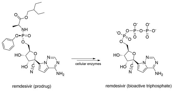 Schematic representation of the enzymatic transformation of remdesivir prodrug into its bioactive form.