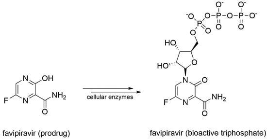 Favipiravir is a prodrug that undergoes a metabolic transformation into favipiravir triphosphate, its bioactive form (Figure 10).