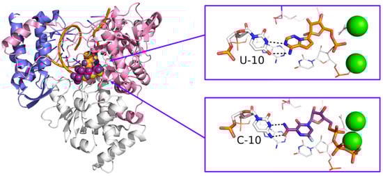 - Šebera, J.; Dubankova, A.; Sychrovský, V.; Ruzek, D.; Boura, E.; Nencka, R. The structural model of Zika virus RNA-dependent RNA polymerase in complex with RNA for rational design of novel nucleotide inhibitors. Sci. Rep. 2018, 8, 11132. [Google Scholar] [CrossRef]