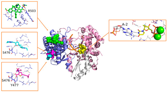 Overview of compounds sofosbuvir (yellow, PDB-ID: 4WTG), beclabuvir (green, PDB-ID: 4NLD), radalbuvir (magenta, PDB-ID: 4EO6), and filibuvir (cyan, PDB-ID: 3FRZ) co-crystallized into the different binding sites of the RdRp of HCV. Residues involved in polar interactions are represented as sticks and are labeled. Polar contacts are highlighted by black dashed lines.