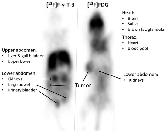 Both radiotracers depict tumor and blood pool, but [18F]FDG concentrations visually appear to be higher in the tumor and in blood. The elevated uptake of radioactivity in the thorax and head following [18F]FDG injection reflects high glucose utilization by heart and brain. In contrast, high uptake of radioactivity in the abdominal region following [18F]F-γ-T-3 injection (Figure 4) is likely to be indicative of extensive first-pass accumulation of this large (MW 624) lipophilic molecule.