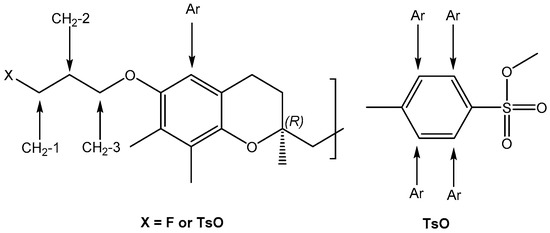 NMR analyses of the non-radioactive compounds focused on resonance shifts arising from substitution of the C6 hydroxyl group of the aromatic ring by ether-linked propyl groups (3-tosylpropyl- and 3-fluoropropyl-). Assignment of proton and carbon resonances of all natural Vitamin E analogues remains incomplete despite the application of multidimensional NMR (HSQC, COSY, ADEQUATE(1,1), C-H HMBC, and NOESY) techniques [28]. Resonances introduced by the 3-(F/TsO)-propyloxy substituent at C6, replacing hydrogen on the C6 hydroxy of γ-T-3, are reported in the experimental section as CH2-1, CH2-2 and CH2-3 (Figure 5).