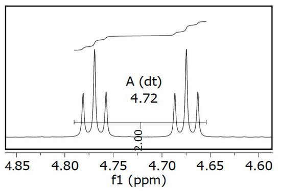 Figure 6 illustrates the resonances of these CH2(s), showing the distinctive coupling pattern indicative of the presence of the propyloxy side arm, especially CH2-1 of F-γ-T-3 which showed the distinctive coupling pattern of dt (doublet of triplet) with coupling constants J = 47.1 and 5.9 Hz, indicating F-H and H-H coupling, respectively (Figure 6).