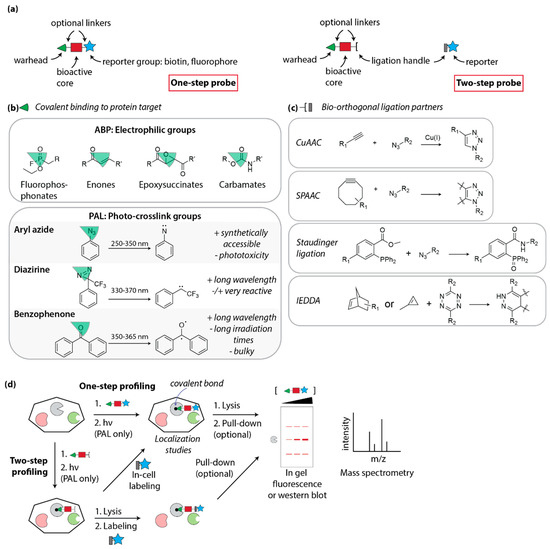 Label-based approaches. (a) General structures of one- and two-step probes. (b) Examples of warheads for activity-based probes (ABP) and photo-affinity labeling (PAL). (c) Examples of bio-orthogonal ligation reactions for use in two-step profiling. (d) Schematic representation of a cell-based profiling experiment, either through direct (one-step) or indirect (two-step) labeling.