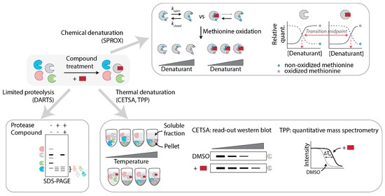 The group of Fitzgerald and co-workers developed a method to detect ligand-protein binding termed “stability of proteins from rates of oxidation (SPROX)” [79]. This method relies on the thermodynamic properties of proteins to fold and unfold, thereby temporarily exposing otherwise buried methionine residues. The propensity of the protein to unfold in the presence of increasing concentrations of denaturing agents such as guanidine hydrochloride or urea is assessed by the hydrogen peroxide-mediated oxidation of exposed methionines. If compound binding shifts the thermodynamic equilibrium of the protein, this will lead to a shift to the so-called “transition midpoint”: the concentration of denaturant needed to obtain equal amounts of Met-peptide:Met(ox) peptide, as determined by coupling SPROX to quantitative shotgun proteomics such as iTRAQ or TMT-labeling (Figure 2) [80,81].