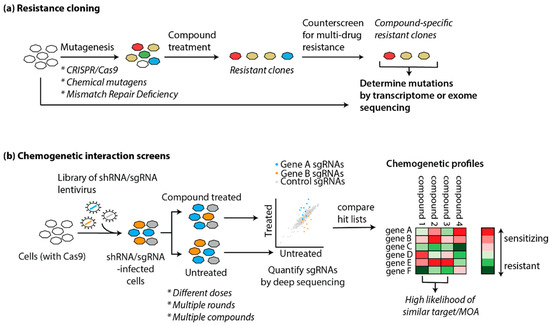 Both label-based and mass spectrometry proteomic approaches are based on the physical interaction between a small molecule and a protein target, and focus on the proteome for target deconvolution. It has been long realized that genetics provides an alternative avenue to understand a compound’s action, either through precise modification of protein levels, or by inducing protein mutations. First realized in yeast as a genetically tractable organism over 20 years ago, recent advances in genetic manipulation of mammalian cells have opened up important opportunities for target identification and MOA studies through genetic screening in relevant cell types [98]. Genetic approaches can be roughly divided into two main areas, with the first centering on the identification of mutations that confer compound resistance (Figure 3a), and the second on genome-wide perturbation of gene function and the concomitant changes in sensitivity to the compound (Figure 3b). While both methods can be used to identify or confirm drug targets, the latter category often provides many additional insights in the compound’s mode of action.