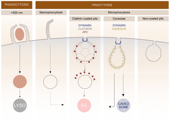 In general, endocytosis is divided into two processes: pinocytosis, by which cells take in fluid and small particles, and phagocytosis, which is performed by specialised cells that have the capacity to uptake larger particles (>500 nm) such as microorganisms and cell debris (Figure 1). Pinocytosis is further divided into macro- and micropinocytosis. By macropinocytosis, cells take in extracellular fluid via large endocytic vesicles which are heterogeneously sized (200–500 nm) termed macropinosomes. In micropinocytosis, specific molecules enter the cell through smaller vesicles and can be further divided to clathrin-mediated endocytosis (70–150 nm) (CME), caveolae-mediated endocytosis (60–80 nm) or non-coated vesicles (Figure 1) [3,17].