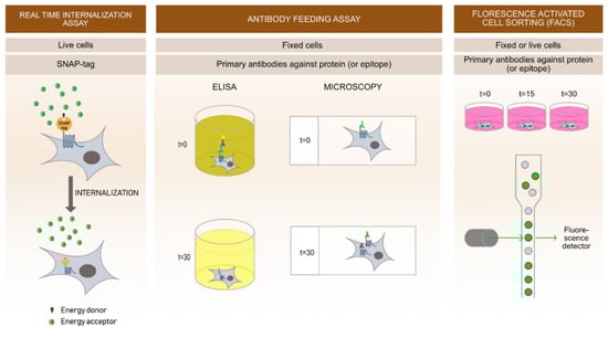 Antibody feeding can be performed using two different principles. With ELISA assays, one of the most useful methods for determination of receptor surface expression, the amount of surface expressed receptors can be quantitatively assessed over time. Secondly, using a microscopy approach, surface expression, and internalized receptors, they can be visualized in different time points after induction of internalization. Internalization can be induced by ligands targeting the studied receptors or in case of constitutively active receptors by inducing a temperature shift. Thereby, it is possible to prevent internalization by cooling the cells (incubation at 4 °C) and induce internalization by incubating the cells at temperatures of 18 °C or higher (usually 37 °C).