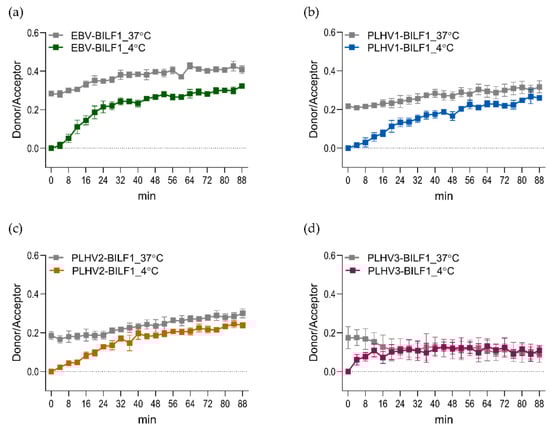 BILF1 receptors internalize constitutively. HEK293A cells were transfected with (a) SNAP-EBV-BILF1, (b) PLHV1-BILF1, (c) PLHV2-BILF1, and (d) PLHV3-BILF1. Donor labelling was performed at 4 °C (coloured curves) and 37 °C (grey curves). Graphs represent means ± SEM of two individual experiments performed in triplicate.