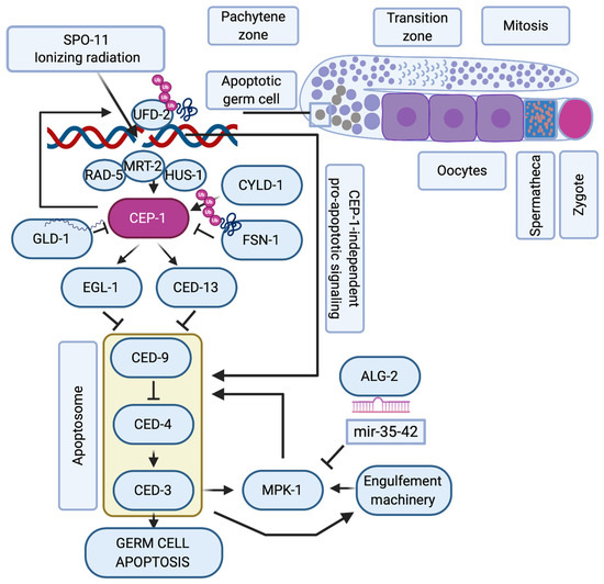 C. elegans p53-like, CEP-1, regulates the apoptotic response to DNA damage during oogenesis. Schematic representation of one arm of the nematode’s germline where mitotic germ cells transit into meiosis. When SPO-11 or ionizing radiation (IR)-induced double-strand breaks persist into late pachytene, the DNA damage checkpoint proteins RAD-5, MRT-2 and HUS-1 induce the activation of CEP-1, that is available only at the late pachytene stage of meiosis when its mRNA translation is no longer repressed by GLD-1. CYLD-1 and FSN-1 regulate CEP-1 stability. CEP-1 transcriptionally induces EGL-1 and CED-13 that alleviate CED-9 sequestration of CED-4, which then ignites the caspase CED-3. The regulation of germ cell apoptosis is further fine-tuned by CEP-1-dependent formation of UFD-2 regulated ubiquitin hubs that promote apoptosis only after resolving the repair machinery amid unrepairable DSBs. When the apoptosome and the engulfement machinery are initiated, they trigger the activation of the ERK-MAPK MPK-1 axis, whose activity is controlled via the ALG-2 regulated microRNAs mir-35-42. Only when MPK-1 is activated, is the cell fully committed to undergoing apoptosis, while other pachytene cells continue oogenesis until they are fertilized in the hermaphrodite’s spermatheca to form a zygote.