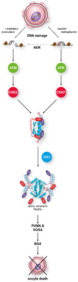 The effect of mutations is even more severe when they arise in a stem cell, as these mutations are inherited by all progeny cells. The most dramatic effects occur in germ cells, with all cells of the developing body and all subsequent offspring being affected. Because of this importance, germ cells have developed specialized quality control systems that consist of specific checkpoints that monitor the integrity of the DNA as well as the correct alignment of homologous chromosomes during meiosis. In oocytes, the details of these quality control processes have recently been elucidated. At least three different checkpoints have been identified that eliminate oocytes, that fail to fulfil the quality control criteria. The first one, named for meiotic silencing of unsynapsed chromatin (MSUC), is triggered when one or two chromosomes are asynapsed and involves extensive heterochromatinization and transcriptional downregulation [7,8]. Oocyte death occurs as a consequence of critical gene silencing for meiotic progression. The second checkpoint also controls correct synapse of homologous chromosomes, however, gets activated when the degree of asynaptic chromosomes is much higher [7,9]. The third checkpoint initiates apoptosis when DNA damage, in particular DNA double-strand breaks (DSBs), is detected. While the first two mechanisms eliminate oocytes with defects in the meiotic process, the third one eliminates oocytes with DNA damage either due to meiotic recombination or caused by other endogenous or exogenous factors. Investigation of this third checkpoint has revealed the mechanism by which female cancer patients treated with chemotherapy become infertile [10,11,12,13,14,15] due to its activation triggered by DNA damage inflicted by γ-irradiation or DNA damaging chemicals (e.g., chemotherapeutic drugs). Here, we review the molecular mechanisms, with a focus on the DNA damage checkpoint, show its evolutionary conservation and discuss the potential for fertility-saving therapies.