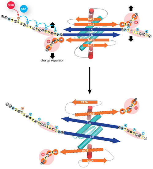 In this dimeric state, TAp63α is stable until DNA damage—in particular, DNA DSBs—is detected. This triggers the activation of a kinase cascade starting with Ataxia Telangiectasia Mutated kinase (ATM), which phosphorylates histone H2AX to mark the position of the lesion and also activates the Checkpoint kinase 2 (CHK2) [70]. In an elegant study, it was shown that TAp63α is a direct target of activated CHK2, phosphorylating S582, a residue that is situated in a loop between the SAM domain and the TID [71]. This phosphorylation by CHK2, while necessary, is not sufficient for tetramerization and activation of p63 in oocytes [64,72]. Instead, S582-phosphorylated TAp63α becomes a target for another kinase, Casein kinase 1 (CK1). This kinase requires pre-phosphorylated targets with the consensus sequence pS/T-x-x-S/T, where pS/T is either a phosphorylated serine or threonine residue and x any amino acid [73,74]. In TAp63α, a stretch with four serines/threonines showing this pattern follows S582 and is phosphorylated by CK1 (Figure 2). Mutational analysis has revealed that the third phosphorylation event is the most critical one for the activation process [72]. Mutating this third serine (S591) to alanine abrogates activation of TAp63α, while mutating the fourth residue, T594, to alanine only slows down activation. Interestingly, measuring the phosphorylation kinetics has demonstrated that it is this third phosphorylation that is ~20 times slower than the kinetics for the first two modifications [75]. Mechanistically, the slow third step defines the level of DNA damage that is necessary to kill the oocyte by enabling oocytes with low damage to survive by fast degradation of the activated TAp63α.