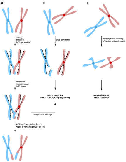 Different pathways lead to oocyte death. (a) During the zygotene stage of meiosis, homologous chromosomes synapse to form aligned pairs. Spo11 induces DNA DSBs that lead to crossovers between homologous chromosomes, which is required for stable synapsis. Repair by homologous recombination results in exchange of genetic material. DNA repair via inter sister-chromatid homologous recombination is suppressed by the HOMRAD1 proteins lining the chromosome axes. After successful DNA repair, Trip13 removes HOMRAD1 proteins, enabling DNA repair to occur via the inter-sister chromatid pathway. If DNA damage is detected that cannot be effectively repaired, oocyte death is initiated via the CHK2/CHK1/TAp63α pathway. (b) failure to align homologous chromosomes correctly, e.g., in Spo11−/− oocytes, inhibits DNA repair by homologous recombination using the homologous chromosome as a template. At the same time, inter-sister chromatid repair is suppressed by the HOMRAD1 proteins. The persistent DNA DSBs lead to activation of the CHK2/CHK1/TAp63α pathway and oocyte death. (c) if a small number of chromosomes is not correctly aligned, heterochromatinization leads to suppression of transcription and oocyte death via the MSUC pathway.