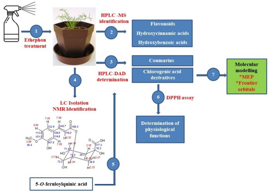 The aim of this paper was to evaluate the effect of ethylene on the protective non-enzymatic system of tetraploid chamomile plants, including the accumulation of essential antioxidants, such as flavonoids, cinnamic acids derivatives, and coumarin-like compounds. Based on the ethephon induced changes in the accumulation of chlorogenic acid derivatives and due to the detailed identification of 5-O-feruloylquinic acid (5-FQA) isolated from chamomile, offered in this paper, we could determine the role of individual chlorogenic acids in chamomile plant physiology, which had been evaluated at minimum up to now. A comparison of their antioxidative activity and evaluation of changes in their ethylene-induced accumulation can support a hypothesis that 5-FQA represents a storage form of chlorogenic acid derivatives in chamomile plants. In addition, an evaluation of the major chemical constituents by quantum chemical studies (DFT B3LYP/3-31G**), such as maps of molecular electrostatic potential (MEP), frontier orbital’s (HOMO and LUMO) of chlorogenic acid, 1,5-DCQA, and 5-FQA was conducted. The general scheme summarizing the methodological steps is presented in Figure 1.