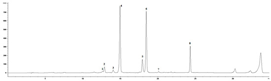 HPLC-DAD chromatogram of methanolic extract of Matricaria chamomilla leaves (320 nm) in time 0 h. (1) Skimmin, (2) daphnin, (3) chlorogenic acid, (4) Z-GMCA, (5) 5-FQA, (6) E-GMCA, (7) 1,5-DCQA, (8) herniarin.