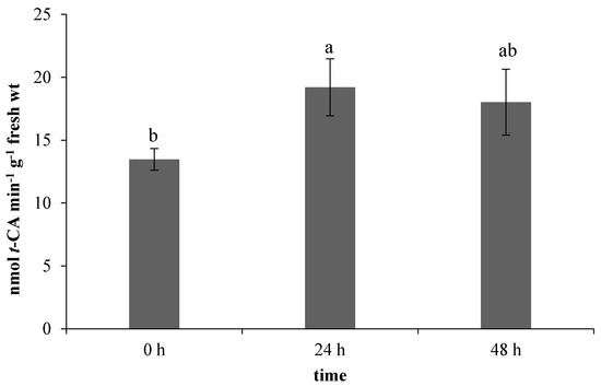 One of the first products of the phenylpropanoid pathway after the formation of cinnamic acid are the active forms of its derivatives, such as p-coumaric, caffeic, sinapic, or ferulic acid [22]. Our results in Table 1 show an increased production of the mentioned phenolic acids, already 24 h after the last treatment, except for the p-coumaric acid. The most significant increment was recorded for syringic acid (about 170%). Other substantial elevations were monitored for the vanillic (50%) and caffeic (34%) acid. Ferulic acid acts as a precursor of vanillic and syringic acid [23], so its slightly increased pool may correlate to the significantly elevated levels of both related acids. Both of them expressed significant antioxidative properties, and they are useful as free radical scavengers [24]. The reason for p-coumaric acid’s decreased content correlates with its precursor role in the biosynthesis of caffeic acid and its related derivatives (feulic, vanillic and syringic acid), in which the content was enhanced as mentioned above.