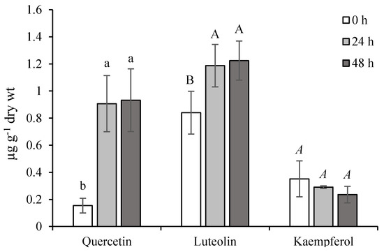 From our results, the qualitative and quantitative determination of free quercetin, luteolin, and kaempferol aglycons in ET-treated leaves indicates the mobilization of active forms in conditions simulating stress stimuli. During normal conditions, their levels seemed to be in the following order: Quercetin < kaempferol < luteolin (Figure 5). The accumulation of quercetin and luteolin arose substantially 24 h from the last ET-treatment and simultaneously, the kaempferol level decreased. This state was maintained during the experiment. In general, quercetin is the most abundant flavonoid in plants, acting as an effective protectant against the harmful effects of ROS [25]. Thanks to the dihydroxylated B-ring of luteolin and quercetin, both could be considered as better antioxidant agents than monohydroxylated flavonoid derivatives (such as kaempferol) [26]. Their ET-stimulated production and antioxidant potential destined them for participation in the active non-enzymatic antioxidant system of chamomile.